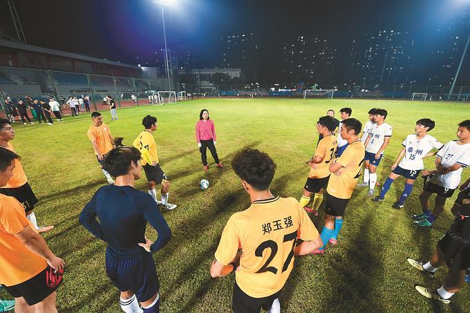 “苏超”绿茵场上,年轻的泰州队挥洒汗水、奋力拼搏。与职业球队不同,泰州队固定集训大多安排在晚上,因为白天他们是警察、电信员工、私营企业主、高中学生……只有下班或者放学后才能集中训练。“一个个普通人奔跑的身影,让更多人感受到足球的魅力,体会到足球原来可以如此快乐。”每次集训时,周高萍除了带领队员们系统开展体能储备与战术磨合外,还会复盘过往的比赛、制定相应的应对计划,同时,她会更多地把自己掌握的比赛经验传授给队员们。在她看来,虽然看上去每个队员持球时间不长,但就如同下围棋,其实球场瞬息万变,每个人都要不断地研究策略,把几秒钟内本能的反应练成精确无失误的状态。